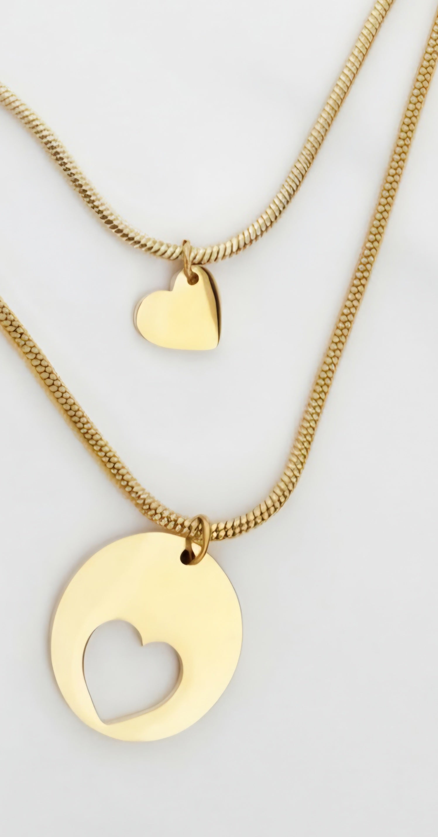Ce duo de colliers est composé de deux pendentifs en forme de cœur complémentaires :