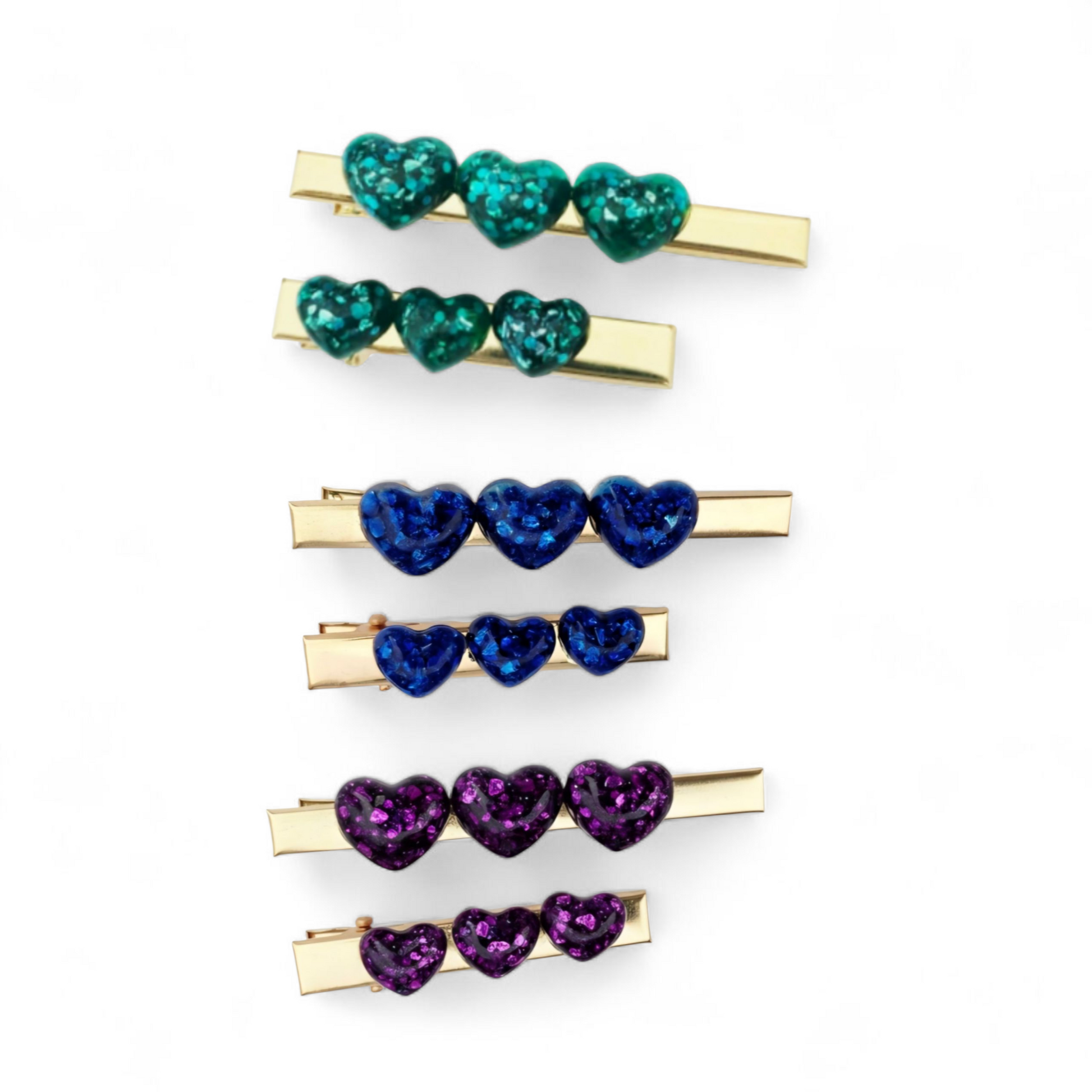 Apportez une touche d’élégance et d’originalité à vos coiffures avec ce duo de barrettes pour cheveux en forme de cœur bleu, vert, violet. Fabriquées à la main en résine scintillante et métal doré, ces accessoires cheveux femme sont idéals pour sublimer vos looks au quotidien ou lors d’occasions spéciales.